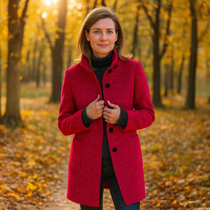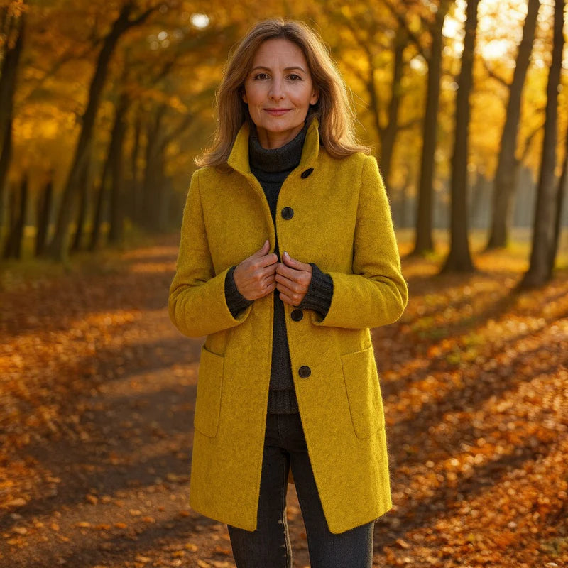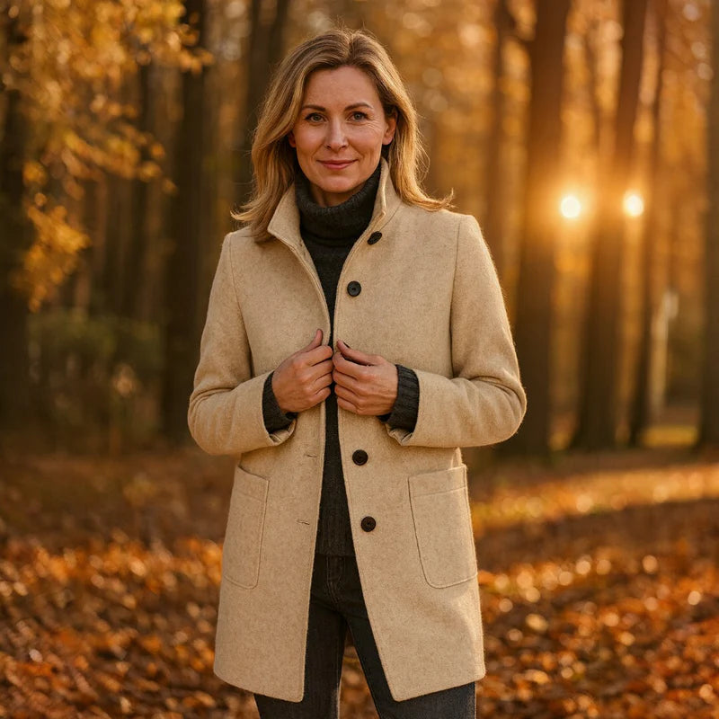 Kappan har en rak, smickrande passform och en stående krage som inte bara känns modern, utan också ger extra skydd mot vinden. Ullmixen känns mjuk mot huden, håller dig behagligt varm och bevarar sin skönhet säsong efter säsong.
